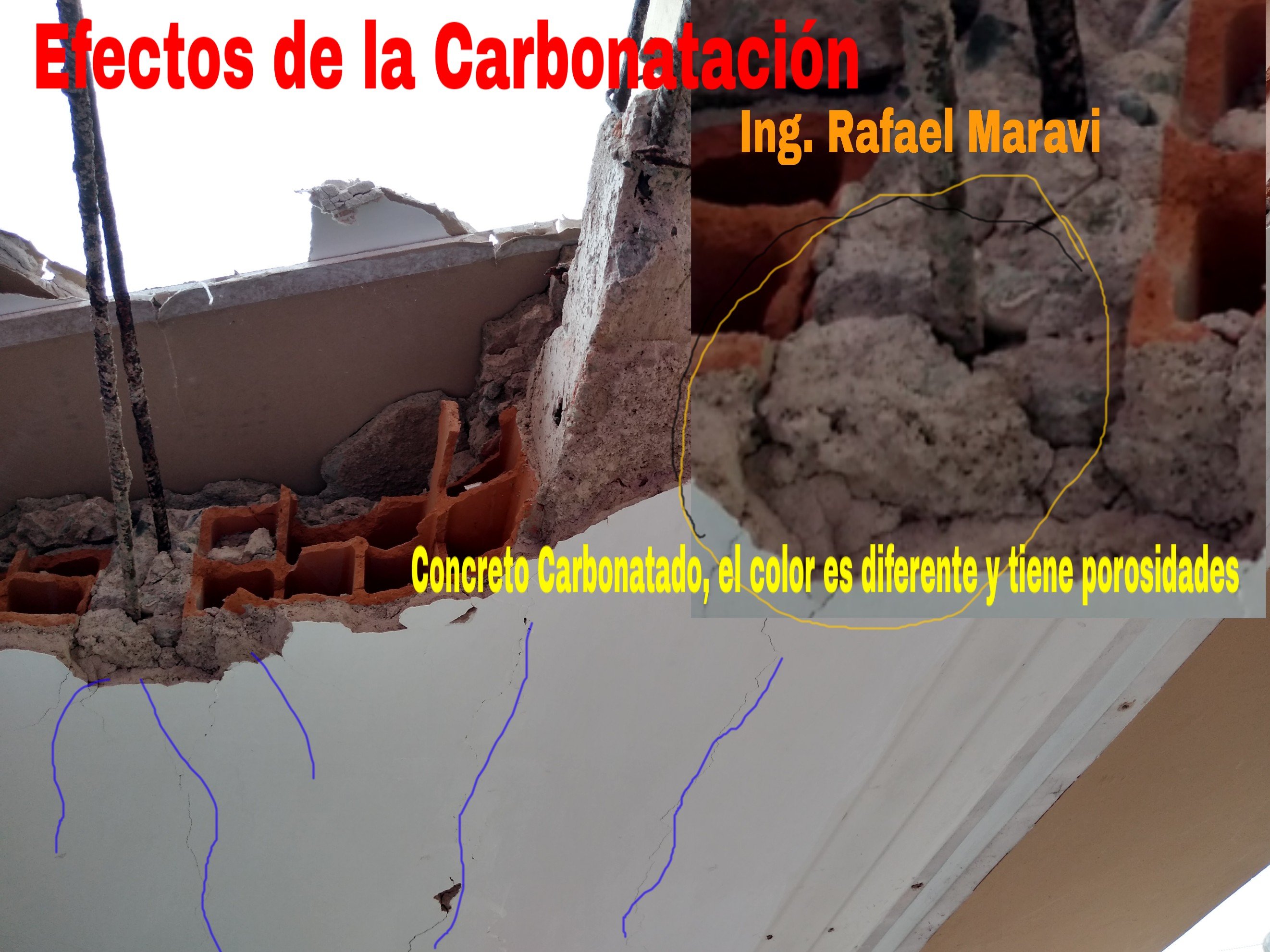 La mala calidad del concreto se manifiesta con la carbonatación dañando techos , se identifica fácilmente cuando las grietas siguen las viguetas. La carbonatación se reconoce por la porosidad y el color del concreto.